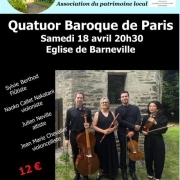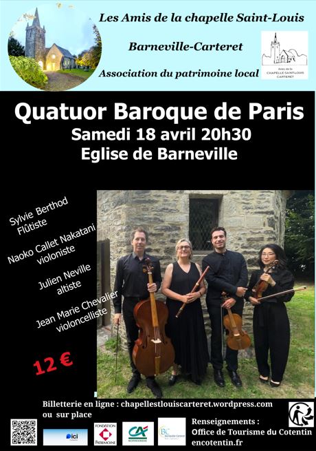 🎶✨ Concert – Quatuor Baroque de Paris ✨🎶La Chapelle Saint Louis a le plaisir de vous inviter à un moment musical d’exception 🎻📍 Lieu : Église Saint Germain d’Auxerre – Barneville-Carteret📅 Date : Samedi 18 avril 2026🕣 Horaire : 20h30🎼 Venez découvrir le talent du 𝗤𝘂𝗮𝘁𝘂𝗼𝗿 𝗕𝗮𝗿𝗼𝗾𝘂𝗲 𝗱𝗲 𝗣𝗮𝗿𝗶𝘀, pour une soirée placée sous le signe de la 𝘮𝘶𝘴𝘪𝘲𝘶𝘦 𝘤𝘭𝘢𝘴𝘴𝘪𝘲𝘶𝘦Un rendez-vous à ne pas manquer pour les amateurs de musique et de patrimoine 🎶👉 Entrée : 12€🎟 𝗕𝗶𝗹𝗹𝗲𝘁𝘁𝗲𝗿𝗶𝗲 𝗲𝗻 𝗹𝗶𝗴𝗻𝗲 : chapellestlouiscarteret.wordpress.comℹ 𝗥𝗲𝗻𝘀𝗲𝗶𝗴𝗻𝗲𝗺𝗲𝗻𝘁𝘀 : Office de Tourisme du Cotentin (Bureau de Carteret)