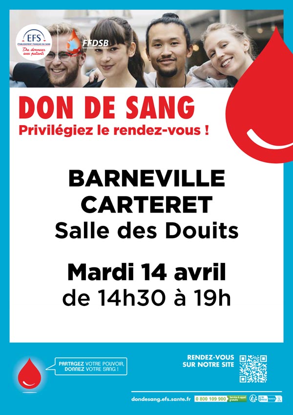 Mardi 14 avril de 14h30 à 19h à la salle des Douits de BARNEVILLE-CARTERET, organisez votre venue en quelques clics : https://efs.link/sgK5f
